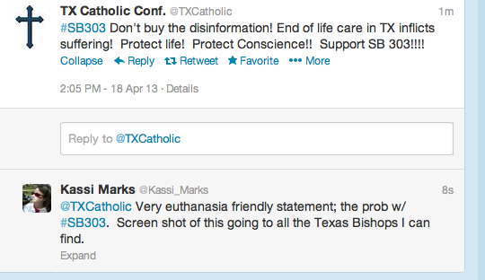 These are confusing times. As we work through the Bob Hall vs. incumbent Dr. Bob Deuell race in State Senate District 2, the issue of SB 303 comes up time and again – as well it should considering the stakes. SB 303, authored by Deuell, was an attempt to amend the Texas Advanced Directives Act; a very bad attempt that would have made the horrible existing law much worse. As a Catholic convert, it pains me that the Texas Catholic Conference of Bishops (“TCC”) supported (and continues to support*) this legislation (the details of which you can read about in a link I provide below). The TCC lobbied for it, testified for it including having a Bishop testify for it, and have attacked groups that opposed it, especially Texas Right to Life. Their Twitter tweeters attacked my husband and I personally (as did Texas Alliance for Life’s people and Sen. Deuell himself and/or his people) when we tweeted opposition to it providing facts by citation to the language of the bill itself that disproved what the supporters claimed. They never attacked with bill language to prove that it was a good bill; they attacked based on talking points unsupported by the bill language.