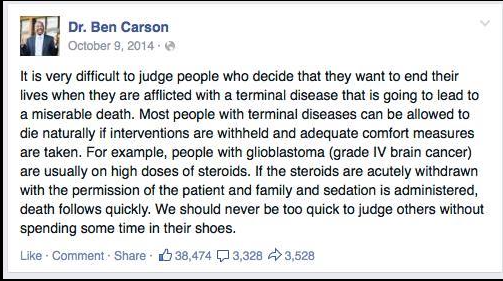 Perhaps Ben Carson can’t see it, but between his flippant remark about the effort to save Terri Schiavo’s life being “much ado about nothing” and his FB post in the wake of Brittany Maynard’s death describing how to, in fact, administer drugs and then withdraw them in a way to bring about the death of the patient (with his or her permission), which is doctor-assisted suicide, he is in favor of both means of bringing about an early death for people. Here is his FB post about Brittany Maynard. Read it very closely and carefully. He is clearly describing a manner of administering drugs, then hastening their withdrawal to bring about death. That is not simply a matter of the patient refusing extraordinary care.