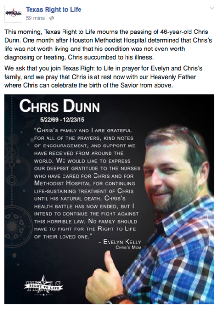 I have a very sad, distressing update for you about Chris Dunn.Today a Texas hospital has blood on its hands, as does everyone and every entity – including at least two “pro-life” organizations and the Texas Catholic Conference of Bishops – who have supported the Texas Advance Directives Act and thwarted every effort made to truly reform it. We had a real opportunity to change this law last session based on legislation supported by Texas Right to Life, but those efforts were co-opted by others whose agenda was not to make this law more patient-centered and pro-life, but rather, to carry the water of the Texas Medical Association and Texas Hospital Association, neither of which is pro-life.Texas Right to Life posted this tribute a little over an hour ago: