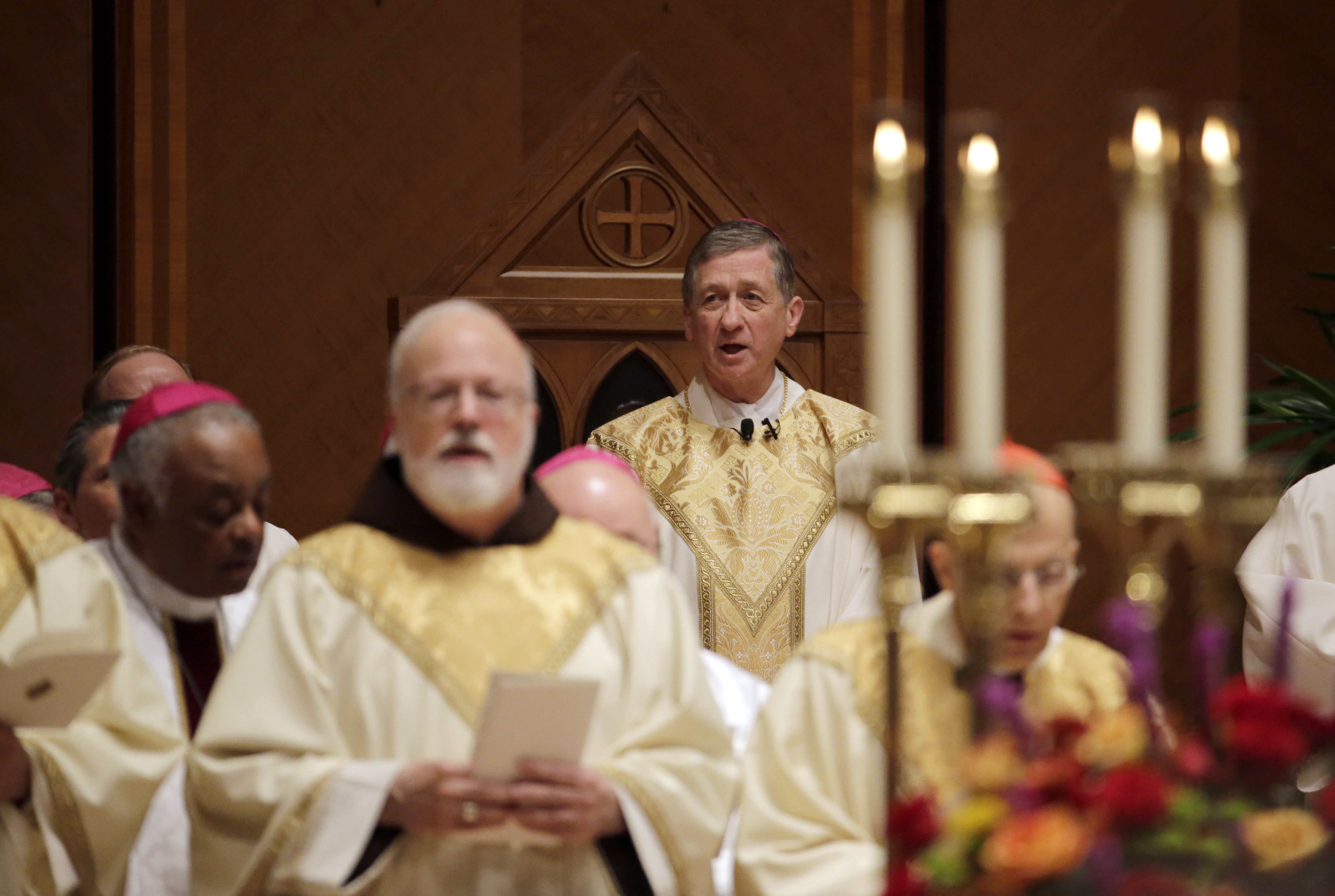 Archbishop Blase Cupich sings from the cathedra (between Cardinal O’Malley and Cardinal Geoge) after his installation during his Installation Mass at Holy Name Cathedral, Tuesday, Nov. 18, 2014, in Chicago. Cupich was named in September by Pope Francis to succeed the retiring Cardinal Francis George. (AP Photo/Charles Rex Arbogast, Pool)