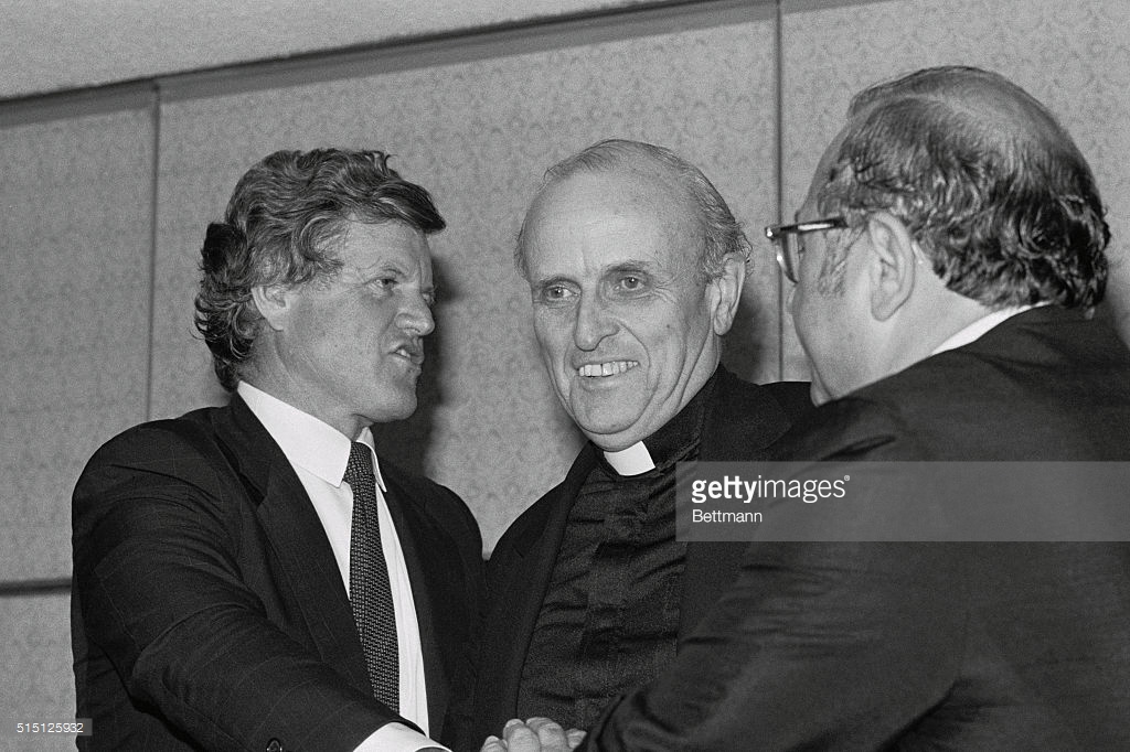 Boston Senator Edward Kennedy chats with Congressman Robert Drinan, S.J.