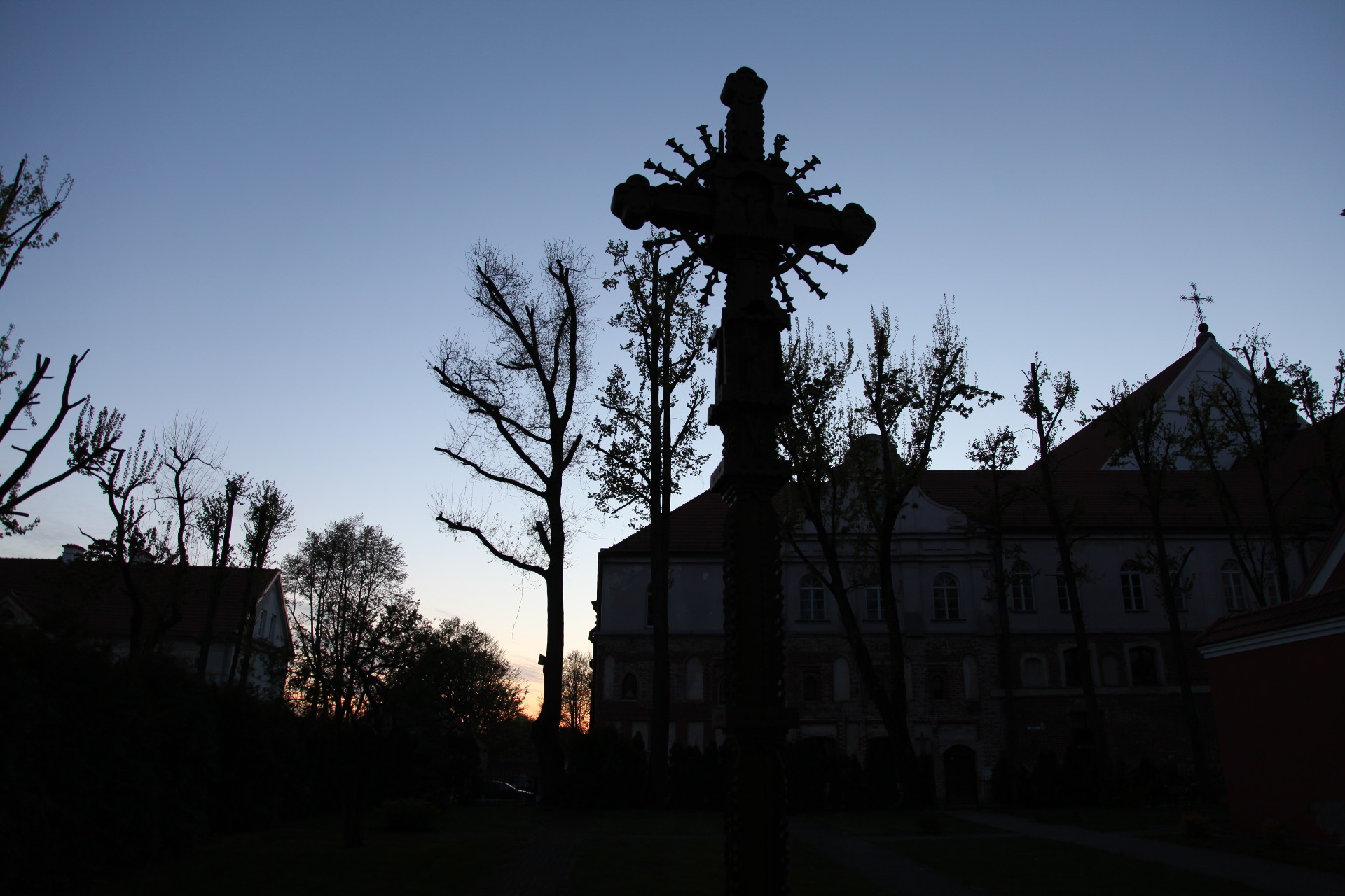 The wooden cross on top of the Franciscan Monastery at Kaunas,Lithuania; photo by David Owen