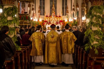 Whether we are at a Low Mass or a High Mass, one of the greatest blessings of the TLM is that, on the one hand, we are gently drawn into prayer, as if by an invisible hand nudging us forward, and, on the other hand, we are not immediately talked to and expected to talk back. We are surely participating in the unfolding drama, but we are not targeted and harried; the activity does not get bogged down in a closed circle, like a boring classroom. The liturgy seems to be going on over our heads or around us or in front of us, and we can relate to it all the more deeply because it is outside our grasp, beyond what we can access, with no possible illusions that we are the ones driving it forward. Of course we have a role to play, and this will sometimes include verbal responses; but the overall effect is one of a giant motion that we can join, if we will, that will take us somewhere our own resources could never get us. The unfailing Introit, announcing the day’s mystery, throws down a sort of spiritual gauntlet: “Friend, wherefore art thou come?” (Mt 26:50).[1] The cascading Kyries, the exultant Gloria, the richly compact Collect, the apt Lesson, invite us to come deeper and deeper into worship, putting on the mind of Christ.
