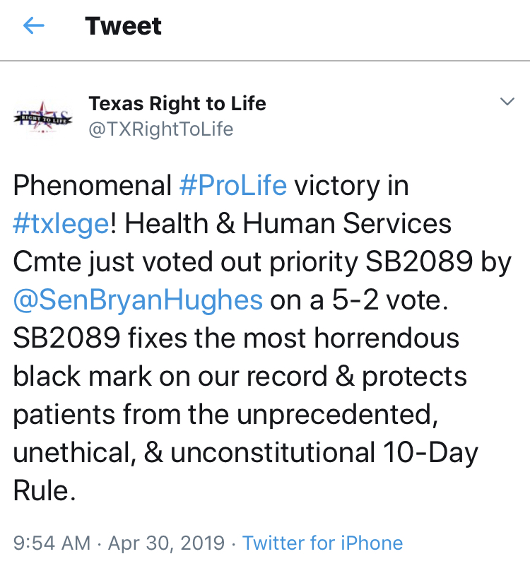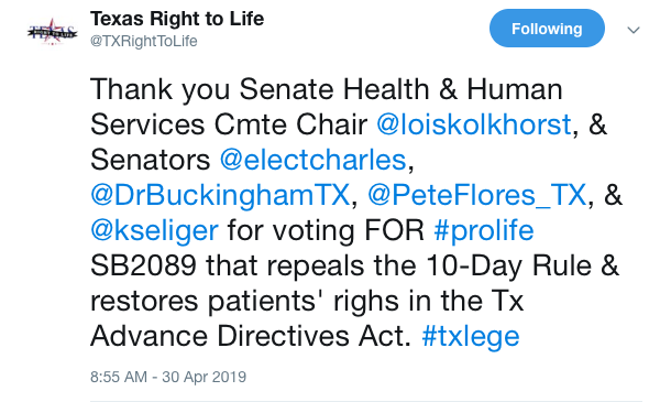 | The Usual Suspects + Faux Life Groups Seek to Kill SB 2089, 2129, & Vulnerable PatientsPosted: 30 Apr 2019 07:31 PM PDTIt has just come to my attention that Texas Alliance for Life (“TAL”), Texans for Life Coalition, the Texas Catholic Conference of Bishops (“TCCB”), the Texas Medical Association, the Texas Hospital Association, the Catholic Health Association of Texas and others have formed a coalition (read their statement here) seeking to kill SB 2089 which I wrote about here, here, here, and here. They offer no alternative language, they want it as dead as the patients subjected to this law. You should know that a much larger coalition of honest and authentic pro-life organizations and individuals have written in support of these bills. You should also recall that vastly more testified and registered in support of these bills – 9 to 1 – than against them as I reported here. This is what the people want because they see the problems with the law as it is currently. Bobby Schindler, an expert on euthanasia, not only testified in favor of this legislation, he wrote an OpEd about it. Noted bioethicist, Wesley J. Smith, has written and testified about Texas’ shameful law as well a number of times and just recently testified along with Bobby Schindler (see the same link above). It’s time that the pro-life and religious organizations that have chosen this path are called out as the fakes they are. One of the primary opponents of these bills is Texas Alliance for Life. It has gone so far as to issue a call to action asking its supporters to oppose these bills. Recall that its executive director sat next to Chris Dunn’s mother and lied about him and his case – under oath – before a Senate committee hearing. These organizations claim – publicly at least – that their support for TADA is about doctor conscience protection. That’s a boldfaced lie. There is no need to kill off sick patients to assuage a doctor’s conscience. I’ve asked these supporters about this directly in the past online and they drop out of comboxes as soon as the question is raised. Just transfer the patient’s care to another doctor or facility. But they oppose that. They oppose removing the alleged issue for a doctor’s conscience. TAL made that clear in its testimony above and in many sessions before this one. They claim that patients want every available medical intervention indefinitely. Again, that’s not true and we’ve addressed that before and did so in testimony just a few weeks ago. These organizations oppose giving patients the right to direct their own care and maintain life-sustaining treatment as their diseases overtake them. In some cases, they’d kill off a patient who can make a recovery. They SUPPORT withdrawing life-sustaining care against a patient’s will – they SUPPORT involuntary passive euthanasia. TAL’s own board members have stated so very clearly in published writings. What they support – the only thing they support – is killing off a patient prematurely and against his will. And at least two or three of these organizations claim the mantle of pro-life. What is pro and life about what they are doing here? This very letter they are a signatories to talks about ending suffering. That is euthanasia. TAL, in particular, is again supporting the very definition of euthanasia. But these patients are often not suffering or the extent of it is unknowable. Moreover, that’s a call for them to make or their families. Some of these organizations or their leaders claim Catholicism; but as you may know, Catholicism teaches about redemptive suffering. And, the ugly truth is, what these hospital ethics committees actually base these decisions on is a “quality of life” determination. That’s not for them to decide either. They don’t claim conscience issues either. Not there. Not then. And, again, even if that were valid, it could be addressed without killing the patient. Let me be clear about this as well: it does not matter that others went along with this as the lesser evil it was back in 1999 when they were forced into it. I’ve addressed this time and again and most recently said: You need to know that others who may have initially supported this law in the beginning have come to regret that because whatever was intended, assuming arguendo that there was ever anything benevolent intended here by the doctors’ and hospitals’ lobbies, that is not what happened and that is not what goes on behind closed doors. We have to fix whatis in this law and how it is used and be honest about those problems. Having some misguided loyalty (or worse) to a law you helped create 20 years ago that is a disaster only speaks to your issues but not to the realities of the law. Nor does that undermine or shine a negative light on the others who saw the error in the law and have worked tirelessly to fix it and help those affected by it. Those who attack Texas Right to Life on this point are wrong to do so. Their arguments are as unpersuasive as they are illogical, absurd, and, in some cases, based on outright lies (and I’m going to prove that to you soon). And, if Texas Right to Life is a little less likely to believe the medical lobby and those supporting the medical lobby, well, the old saying “Fool me once….” applies here in spades. Understand that these faux life groups and the TCCB as well as the Catholic Health Association of Texas are allying themselves with at least one organization that supports abortion, for Pete’s sake. Do we really need to know anything else to judge that these organizations have – at a minimum – lost their way and cannot be trusted on matters of life? Texas Right to Life has addressed this ridiculous argument time and again as well. They see this law doesn’t work for patients – it works against them – and that the very organizations that make up this coalition who oppose these bills lied in 1999 and continue to do so. As the on