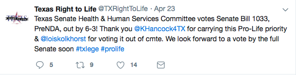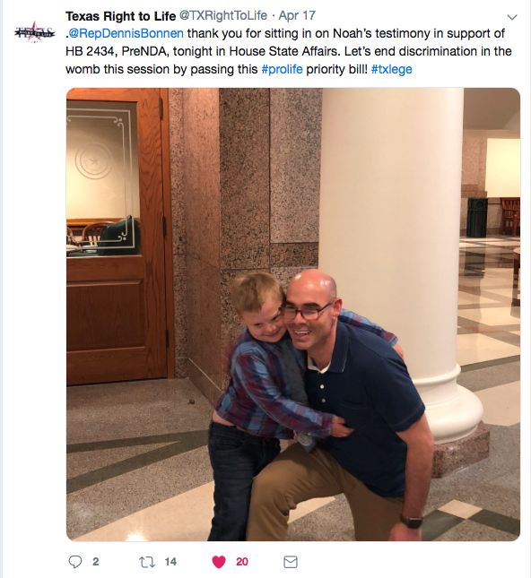 | Update on SB 1033 – PASSED Out of Senate HHS Committee! Posted: 30 Apr 2019 03:11 PM PDTI’m a little late in getting this post out there as this news broke during Orthodox Holy Week and I was otherwise occupied, but I didn’t want this news to pass without blogging about it as well. The PreBorn Non-Discrimination Act (“PreNDA”), SB 1033, passed out of the Senate Health & Human Services Committee last week, on April 23, 2019, by a vote of 6-3. This is great news! This bill needs a full floor vote, but there is movement, thanks be to God! Also, a hearing was held on its companion bill, HB 2434, on April 17, 2019, before the House HHS Committee. I watched part of that testimony which started very late in the evening and went until the wee hours of the morning of April 18. There were vastly more in favor of it than against it. It has not been voted on there as yet. One of my favorite testimonies came from this little boy who is pictured with Speaker Bonnen: Should he not have been born? It’s just unfathomable to me that anyone who calls themselves pro-life would support this sort of discriminatory abortion. All human life has dignity and value and is worthy of protection and support. Of course, there were testimonies of families pressured to abort after a diagnosis and testimonies of those who were given an inaccurate diagnoses and pressured to abort. It’s utterly diabolical. I’ve read of such incidents the whole time I’ve been in the pro-life movement. But it is quite another matter to watch people give their testimonies in a hearing and under oath. If that doesn’t move you, I don’t know what else will. What if they had succumbed to this pressure? And, why are doctors pressuring them to choose death anyway? So much for pro-choice, which has always been a lie anyway. This is clearly about eugenics. “Cleansing” society of the least among us – those determined to have less value and be useless. Margaret Sanger’s philosophy. It’s sick. It’s wrong. It’s Naziism in it’s truest form. And it is everywhere. Iceland claims to have “eradicated” Down Syndrome. How? Genocide. 100% abortion rate for those pregnancies with that diagnosis. Very progressive, no? Note that America is quickly trying to catch up with places like Iceland. We should have no part of it and it and similar diagnoses certainly should not form the basis for exceptions to otherwise pro-life legislation, which is what we have had thus far even in Texas. I salute all those who are working on this legislation for seeing the value of all life and working to protect it – and for their consistent life ethic that is so often absent among groups I have come to call faux life groups. We must be consistent or we lose the argument by default and simple logic. I’ll let you know more when I do. Thanks for reading! |