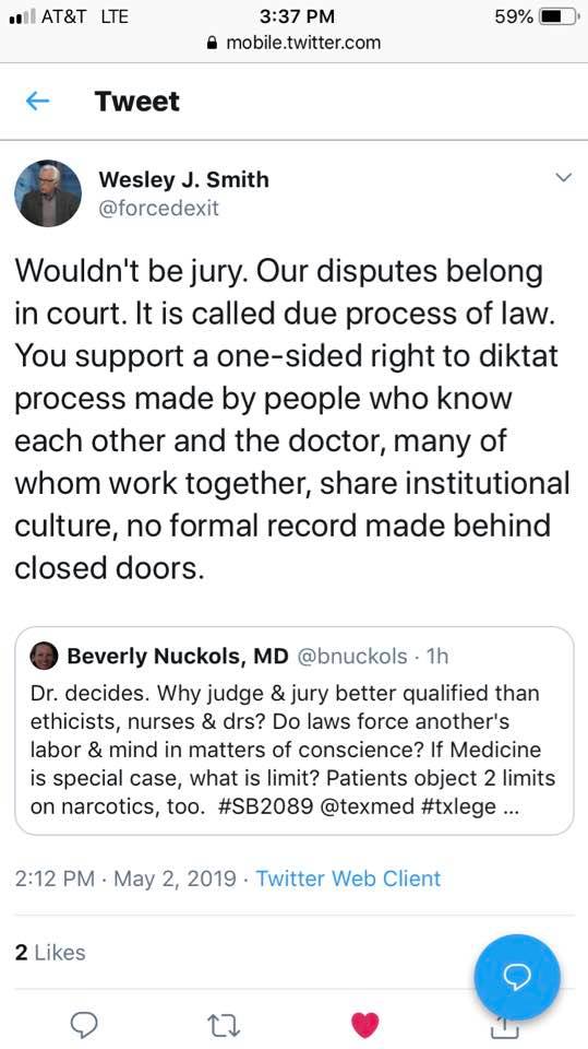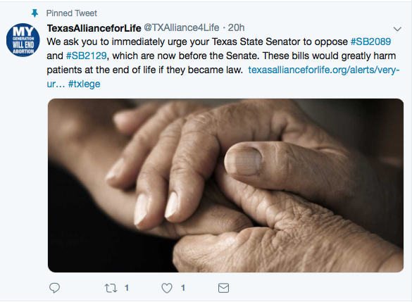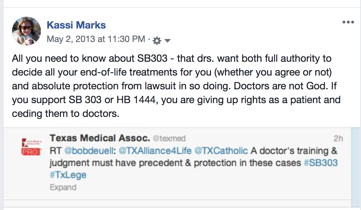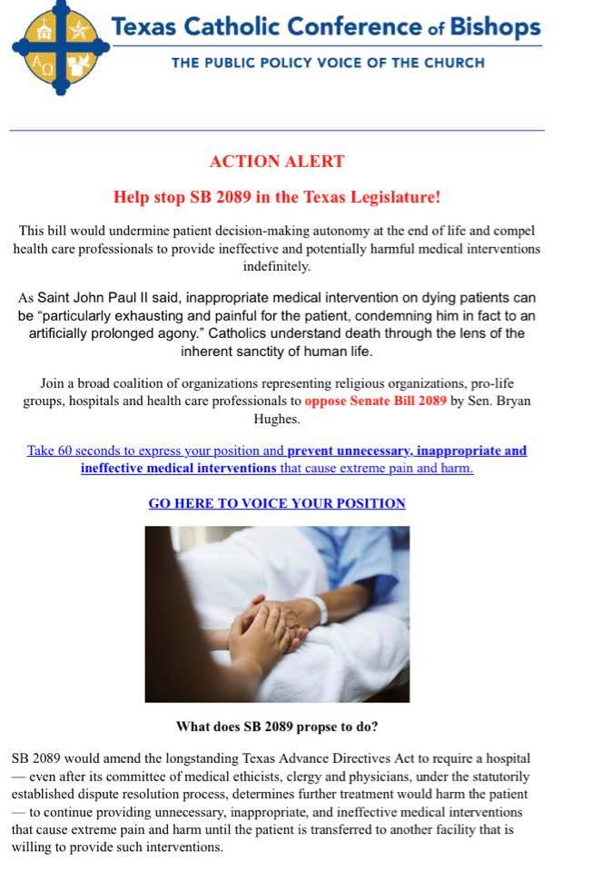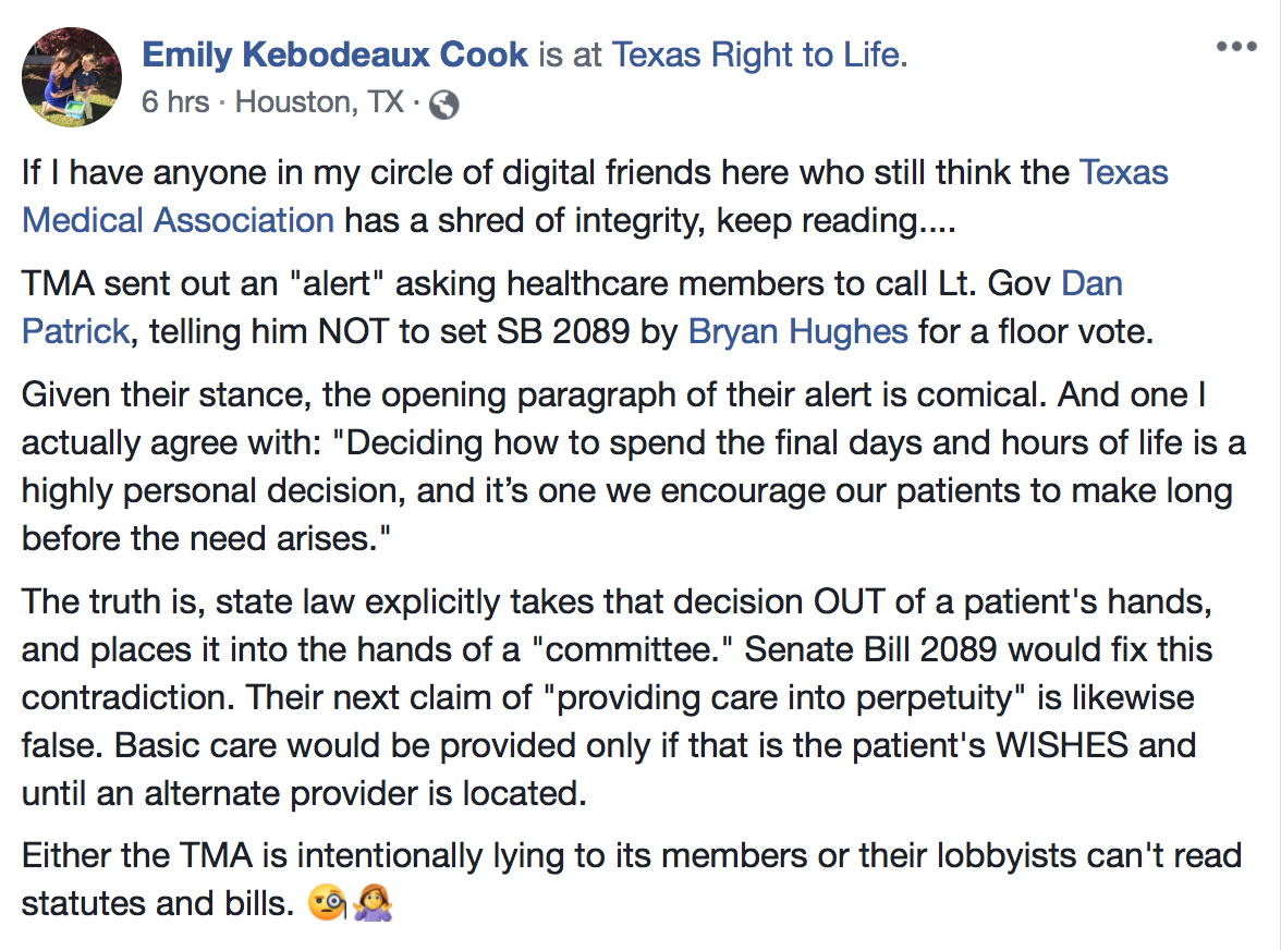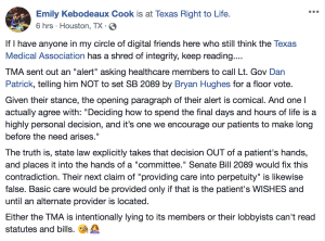 Opponents to this bill think only doctors and the ethics committee members (which, by the way, often are without an ethicist even if such were always reliably ethical). They don’t believe you have that right or the capability to make that decision. Don’t believe me? See the tweets and calls to action below and note the tone and dishonestly of the TMA missive. Go to the thread on Twitter for #SB2089 and read. You will be illuminated and probably a bit horrified by what certain alleged pro-life groups, religious groups, and doctors believe about you and your right to life!