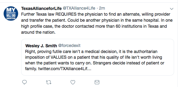 | UPDATES: The Usual Suspects Double Down – RESIST THEM & SUPPORT LIFEPosted: 02 May 2019 09:26 PM PDTSEE THE END FOR UPDATES. Friends, not only have the usual suspects signed onto a coalition letter opposing the life-affirming SB 2089, they are really showing their true colors, their incessant, unyielding promotion of euthanasia, and continued support for the deprivation of due process rights for patients. I have a lot to show you and time is short. Read on. I was provided with this call to action from the Texas Medical Association. Pro-life doctors are concerned. TELL THE LT. GOV: DO NOT SET SB 2089 FOR A VOTE Dear Dr. Deciding how to spend the final days and hours of life is a highly personal decision, and it’s one we encourage our patients to make long before the need arises. Yet a bill just voted out of the Senate Health and Human Services Committee would subvert the Texas Advance Directive Act (TADA), signed into law in 1999 by then-Gov. George W. Bush: Senate Bill 2089 by Sen. Bryan Hughes (R-Mineola). Simply put, SB 2089 would violate our personal liberties of conscience and force extra suffering on our patients. SB 2089 would require hospitals, physicians, nurses, and other health care professionals to provide medically inappropriate and potentially harmful care for an unlimited period of time. Requiring care in perpetuity would prolong the dying process, exacerbate suffering for both patients and loved ones, and violate the standard of care to do no harm. Yesterday, the Senate State Affairs Committee voted to approve SB 2089. It now rests with Lt. Gov. Dan Patrick, who will decide if and when to set the bill for debate on the Senate floor. That cannot happen. SB 2089 must be stopped now. Please contact Lieutenant Governor Patrick today and urge him NOT to set SB 2089 for a floor debate. It’s imperative that you help us educate the lieutenant governor that this bill interferes with professional medical judgment. You can use the new TMA Grassroots Action Left to quickly and easily share your message with Lieutenant Governor Patrick via email or Twitter. Or you can call his office directly at (512) 463-0001. Either way, you’ll find talking points to use in the Grassroots Action Left. Please call or write today. We must prevent SB 2089 from being heard on the Senate floor. Sincerely, Douglas W. Curran, MD President Texas Medical Association The TMA lies. That’s right. I’m not mincing words. Listen to me: THEY LIE. This bill would require treatment until transfer. Transfer being the goal when a doctor decides a patient is better off having his death hastened by withdrawal of life-sustaining (not unlimited interventions of any type, by the way – that is a red herring they use constantly – NO ONE ARGUES FOR THAT – they argue against something no one else supports). As I have said to Dr. Joe Pojman, Dr. Beverly Nuckols, in my testimony, and on this blog and my other posts for years – as have many others – not all doctors have the same conscience formation. For instance, some think abortion is fine and have a conscience untroubled by it being legal or even performing it. Some think euthanasia is fine – clearly we see that here – including involuntary euthanasia by refusing and withdrawing life-sustaining care to patients against their will and think only they should make that life and death determination for a patient. We often seek second opinions. Why? Because not all doctors have the same opinions about care, morality, ethics, and who makes the final decision about whether you die early or not. Opponents to this bill think only doctors and the ethics committee members (which, by the way, often are without an ethicist even if such were always reliably ethical). They don’t believe you have that right or the capability to make that decision. Don’t believe me? See the tweets and calls to action below and note the tone and dishonestly of the TMA missive. Go to the thread on Twitter for #SB2089 and read. You will be illuminated and probably a bit horrified by what certain alleged pro-life groups, religious groups, and doctors believe about you and your right to life! Understand that while the TMA may be the lobbying arm of the largest medical association in the state, not all doctors subscribe to their pro-abortion, pro-euthanasia, anti-patient, and anti-due process ways. For instance, see this by the Association of American Physicians and Surgeons: The AAPS Texas Chapter supports Advance Directive Act reform that strengthens patients’ rights. pic.twitter.com/xjfDsphJZ8— AssocAmerPhys&Surg (@AAPSonline) May 1, 2019 I am so grateful that other doctors and their organizations are promoting life and a balanced, due process for these tough decisions. (Doctors can’t easily control who represents them in the lobbying arm of their organization (lawyers have the same problem, this is why I’m not a member of the American Bar Association any longer) and I don’t believe for a moment that even most doctors would support this. But their lobbying arm is out of control and bloodthirsty. They must be stopped. The grassroots is larger and always show up in greater numbers than they do when these bills are heard in committees, as I mentioned in a prior post.) Texas Right to Life’s Emily Cook responded correctly: You need to know how extreme these views by those opposing SB 2089 are. For instance, this doctor tweeted that only doctors can made these decisions. Understand, she was saying this to an ETHICIST, Wesley J. Smith, who is pro-life and an attorney who understands due process and the requirements of it that are utterly lacking in the current law. He handily addressed her and the Executive Director of TAL who had the audacity to question whether Smith had training in ethics and medicine (this, the man who sat next to Chris Dunn’s mother and lied about Chris’ case and condition under oath during the hearing on SB 2089). This is the same stuff as what the Tex