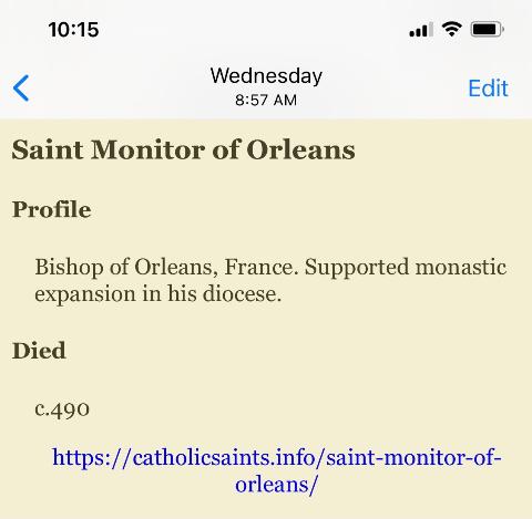 St. Monitor of Orleans [https://catholicrehttps://catholicreadings.org/saint-monitor-of-orleans-saint-of-the-day-november-10/adings.org/saint-monitor-of-orleans-saint-of-the-day-november-10/]